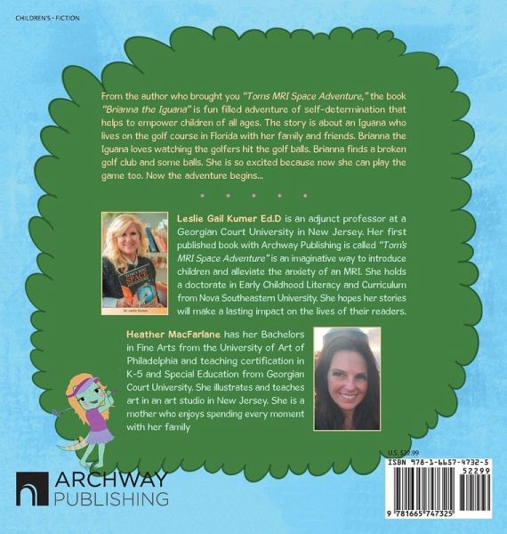 From the author who brought you "Toms MRI Space Adventure." The book "Brianna the Iguana" is fun filled adventure of self-determination that helps to empower children of all ages. The story is about an Iguana who lives on the golf course in Florida with her family friends. Brianna the Iguana loves watching the golfers hit the golf balls. Brianna finds a broken golf club and some balls. She is so excited because now she can play the game too. Now the adventure begins...