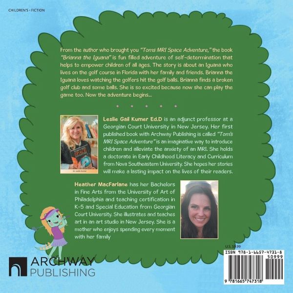 From the author who brought you "Toms MRI Space Adventure." The book "Brianna the Iguana" is fun filled adventure of self-determination that helps to empower children of all ages. The story is about an Iguana who lives on the golf course in Florida with her family friends. Brianna the Iguana loves watching the golfers hit the golf balls. Brianna finds a broken golf club and some balls. She is so excited because now she can play the game too. Now the adventure begins...