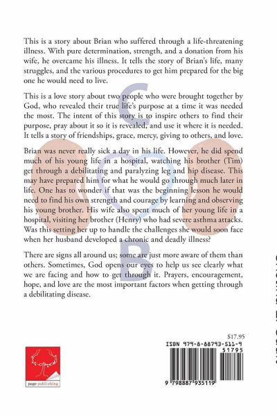 This is a story about Brian who suffered through a life-threatening illness. With pure determination, strength, and a donation from his wife, he overcame his illness. It tells the story of Brian's life, many struggles, and the various procedures to get him prepared for the big one he would need to live. This is a love story about two people who were brought together by God, who revealed their true life's purpose at a time it was needed the most. The intent of this story is to inspire others to find their purpose, pray about it so it is revealed, and use it where it is needed. It tells a story of friendships, grace, mercy, giving to others, and love. Brian was never really sick a day in his life. However, he did spend much of his young life in a hospital, watching his brother (Tim) get through a debilitating and paralyzing leg and hip disease. This may have prepared him for what he would go through much later in life. One has to wonder if that was the beginning lesson he would need to find his own strength and courage by learning and observing his young brother. His wife also spent much of her young life in a hospital, visiting her brother (Henry) who had severe asthma attacks. Was this setting her up to handle the challenges she would soon face when her husband developed a chronic and deadly illness? There are signs all around us; some are just more aware of them than others. Sometimes, God opens our eyes to help us see clearly what we are facing and how to get through it. Prayers, encouragement, hope, and love are the most important factors when getting through a debilitating disease.