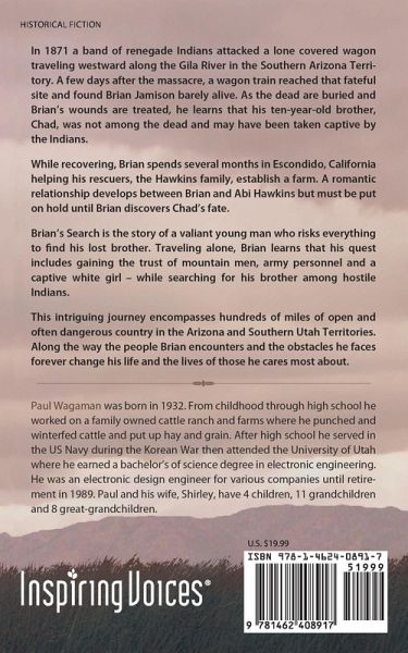 In 1871 a band of Indians attack a lone covered wagon traveling westward along the Gila River in Southern Arizona Territory. A few days later, a wagon train reaches that fateful site and finds Brian Jamison barely alive. They bury the dead and treat Brian's wounds, whereupon he learns that his ten-year-old brother, Chad, was not among the dead and may have been taken captive. While recovering, Brian spends several months in Escondido, California helping the Hawkins family establish a farm. A romantic relationship develops between Brian and Abi Hawkins. Nevertheless, Brian cannot rest until he discovers Chad's fate. Brian's Search is the story of a valiant young man who risks everything to find his lost brother. Traveling alone, Brian soon learns his quest must include exhaustive questioning of mountain men and army personnel about rumors of white captives among the Indians. His journey encompasses hundreds of miles of open and often dangerous country in Arizona and Southern Utah Territories. Along the way the people he encounters and the obstacles he faces forever change his life and the lives of those he cares about.
