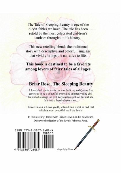 "Briar Rose, The Sleeping Beauty", is destined to be a favorite among lovers of fairy tales of all ages. The tale of Sleeping Beauty is one of the oldest fables we have. The tale has been retold by the most celebrated children's authors throughout it's history. This new retelling blends the traditional story, "Sleeping Beauty," with descriptive, colorful language that vividly brings the narrative to life. This 116 page, beautifully embellished retelling builds of the traditional story, omitting some of the darker elements in the very oldest versions from the early Middle Ages, which must have served as a cautionary tale, the narrative springs to life, as the reader follows the events of Princess Rose, the Fairies of the realm, and brave Prince Devon, and the unlikely, but indispensable, friends he meets on his quest to find "that which is most beautiful in all the lands". 15 beautiful, hand drawn illustrations by the author accentuate the message throughout. A lovely baby princess is born to the King and Queen. She grows up to be a beautiful, sweet and talented young girl, but out of revenge, an evil fairy casts a spell on her and she falls into a hundred-year sleep. Prince Devon, a brave youth, sets out on a quest to find that which is most beautiful in all the lands. In this retelling, travel with Prince Devon on his adventure. Discover the destiny of the lovely Princess Rose. In this retelling, travel with Prince Devon on his adventure. Discover the destiny of the lovely Princess Rose.