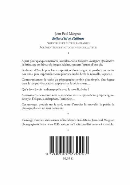 Hormis pour quelques météores juvéniles, Keats, Alain-Fournier, Radiguet, la littérature est labeur de longue haleine, souvent l'oeuvre d'une vie.Se devant d'être la parfaite expression d'une langue, sa production mérite tous nos soins, plus impératifs encore pour ses modes brefs, la nouvelle et la poésie.Comparativement, fugace dans le temps, la tâche du photographe paraît plus simple, plus viser, cadrer, appuyer sur le déclencheur...Qu'a donc à voir la photographie avec le texte littéraire ?Elle aussi, à sa manière, raconte des tranches de vie et possède ses propres figures de style, l'ellipse, la métaphore, l'antithèse.Cet ouvrage, produit sur le tard, associe la nouvelle, la poésie, la photographie.