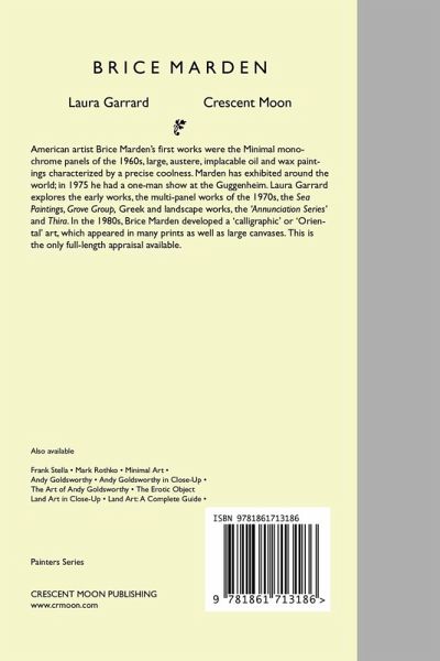 BRICE MARDEN The American artist Brice Marden (b. 1938) is one of the great contemporary painters. Brice Marden's first works were the Minimalist monochrome panels of the 1960s, large, austere, 'implacable' oil and wax paintings characterized by a precise coolness. In 1975 Marden had a one-man show at the Guggenheim Museum. Laura Garrard looks at Marden's artistic career, from the early works, the multi-panel works of the 1970s, the Sea Paintings, Grove Group, Greek and landscape works, and the 'Annunciation Series' and Thira. In the 1980s, Brice Marden developed a 'calligraphic' or 'Oriental' art, which appeared in many prints as well as large canvases. Brice Marden studied at Florida Southern College, Lakeland, and Boston University School of Fine and Applied Arts, receiving a Bachelor of Fine Arts in 1961. That year, he worked at Yale Norfolk Summer School in Connecticut. In 1963 he was awarded a Master of Fine Arts degree in painting from Yale University at New Haven. He moved to New York City, and worked as a guard in the Jewish Museum. At this time he was married to Pauline Baez, the sister of Joan Baez, the singer, and had a son, Nicholas. In the mid-1960s, Marden began to have one-man exhibitions (typically at Bykert Gallery, where he had many shows). In 1966 he became an assistant to Robert Rauschenberg. In the late 1960s, Marden began making multi-panel paintings. He worked as a painting instructor at the School of Visual Arts in New York from 1969-74. He had solo shows and group shows in Europe (Milan, Turin, Paris, Dusseldorf). In 1975 there was the ten-year retrospective at the Guggenheim in New York, unusual for so young an artist. From 1973, Marden visited Greece every year. Other major shows included a one-man exhibition of drawings (1964-74) at Contemporary Arts Museum, a drawing retrospective at Kunstraum Munich, and the Whitechapel and Stedelijk Museum, Amsterdam one-man shows of 1981. An exhibition of prints 1961-91 travelled to the Tate Gallery, London, Baltimore Museum of Art and the Musee d'art moderne de la ville de Paris. This is the only full-length appraisal available. Fully illustrated, with new illustrations.