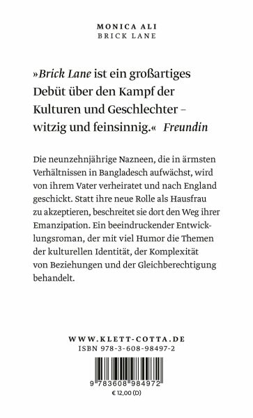 Nach der arrangieren Heirat mit dem 20 Jahre älteren Chanu, findet sich Nazneen in einer winzigen Wohnung nahe der Brick Lane in London wieder - ohne Orts- oder Sprachkenntnisse und ohne Kontakt zur Außenwelt. Doch Nazneen will mehr vom Leben. Sie beginnt gegen den Willen ihres Ehemanns Englisch zu lernen und nimmt schließlich eine Arbeit als Näherin an. Als Karim, ein junger Aktivist in der bengalischen Community Londons, in ihr Leben tritt, entscheidet sich Nazneen endgültig, ihr Schicksal selbst in die Hand zu nehmen. Beeindruckend drastisch und doch mit Humor zeichnet dieser Roman die Transformation eines schüchternen Mädchens zu einer außergewöhnlichen Frau nach. "Brick Lane" ist Monica Alis Debütroman. Er stand auf der Shortlist für den Booker Prize, den George Orwell Prize for Political Writing und den renommierten Commonwealth Writers' Prize.