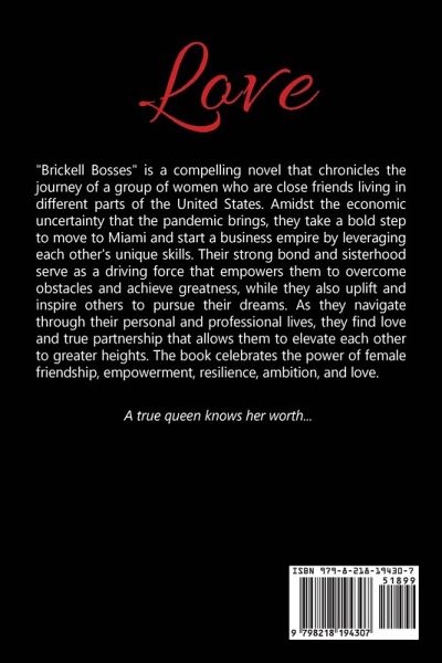 Brickell Boss is a compelling novel that chronicles the journey of a group of women who are close friends living in different parts of the United States. Amidst the economic uncertainty that the pandemic brings, they take a bold step to move to Miami and start a business empire by leveraging each other's unique skills. Their strong bond and sisterhood serve as a driving force that empowers them to overcome obstacles and achieve greatness, while they also uplift and inspire others to pursue their dreams. As they navigate through their personal and professional lives, they find love and true partnership that allows them to elevate each other to greater heights. The book celebrates the power of female friendship, empowerment, resilience, ambition, and love.