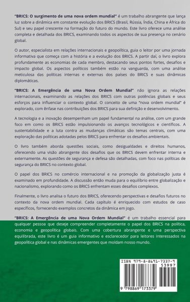"BRICS: O surgimento de uma nova ordem mundial" é um trabalho abrangente que lança luz sobre a dinâmica em constante evolução dos BRICS (Brasil, Rússia, Índia, China e África do Sul) e seu papel crescente na formação do futuro do mundo. Este livro oferece uma análise completa e detalhada dos BRICS, examinando todos os aspectos de sua presença no cenário global. O autor, especialista em relações internacionais e geopolítica, guia o leitor por uma jornada informativa que começa com a história e a evolução dos BRICS. A partir daí, o livro explora profundamente as economias de cada membro, destacando seus pontos fortes, desafios e impacto global. Os aspectos políticos também estão na vanguarda, com uma análise meticulosa das políticas internas e externas dos países do BRICS e suas dinâmicas diplomáticas. "BRICS: A Emergência de uma Nova Ordem Mundial" não ignora as relações internacionais, examinando as relações dos BRICS com outras potências globais e seus esforços para influenciar o contexto global. O conceito de uma "nova ordem mundial" é explorado, com ênfase nas contribuições dos BRICS para sua definição e desenvolvimento. A tecnologia e a inovação desempenham um papel fundamental na análise, com um grande foco em como os BRICS estão impulsionando os avanços tecnológicos e científicos. A sustentabilidade e a luta contra as mudanças climáticas são temas centrais, com uma exploração das políticas adotadas pelos BRICS para enfrentar os desafios ambientais. O livro também aborda questões sociais, como desigualdades e direitos humanos, oferecendo uma visão abrangente dos desafios que os BRICS devem enfrentar interna e externamente. As questões de segurança e defesa são detalhadas, com foco nas políticas de segurança do BRICS no contexto global. O papel dos BRICS no comércio internacional e na promoção da globalização justa é examinado em profundidade. A discussão então muda para o equilíbrio entre globalização e nacionalismo, explorando como os BRICS enfrentam esses desafios complexos. Finalmente, o livro analisa o futuro dos BRICS, oferecendo perspectivas e desafios futuros no contexto da nova ordem mundial. Cada capítulo é enriquecido com estudos de caso específicos, fornecendo exemplos concretos da dinâmica em jogo. "BRICS: A Emergência de uma Nova Ordem Mundial" é um trabalho essencial para qualquer pessoa que deseje compreender completamente o papel dos BRICS na política, economia e geopolítica globais. Com uma cobertura abrangente e uma perspectiva equilibrada, este livro é um guia informativo e esclarecedor para leitores interessados na geopolítica global e nas dinâmicas emergentes que moldam nosso mundo.