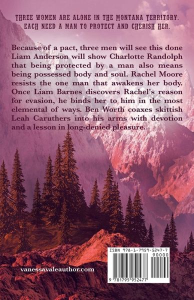 Three women are alone in the Montana Territory. Each need a man to protect and cherish her. Because of a pact, three men will see this done. Liam Anderson will show Charlotte Randolph that being protected by a man also means being possessed body and soul. Rachel Moore resists the one man that awakens her body. Once Liam Barnes discovers Rachel's reason for evasion, he binds her to him in the most elemental of ways. Ben Worth coaxes skittish Leah Caruthers into his arms with devotion and a lesson in long-denied pleasure.