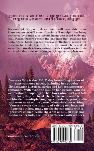 Three women are alone in the Montana Territory. Each need a man to protect and cherish her. Because of a pact, three men will see this done. Liam Anderson will show Charlotte Randolph that being protected by a man also means being possessed body and soul. Rachel Moore resists the one man that awakens her body. Once Liam Barnes discovers Rachel's reason for evasion, he binds her to him in the most elemental of ways. Ben Worth coaxes skittish Leah Caruthers into his arms with devotion and a lesson in long-denied pleasure.