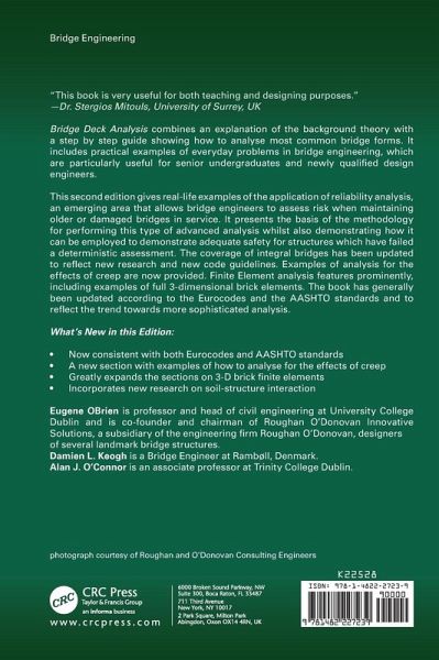 Captures Current Developments in Bridge Design and Maintenance Recent research in bridge design and maintenance has focused on the serviceability problems of older bridges with aging joints. The favored solution of integral construction and design has produced bridges with fewer joints and bearings that require less maintenance and deliver increased durability. Bridge Deck Analysis, Second Edition outlines this growing development, and covers the structural analysis of most common bridge forms. It introduces reliability analysis, an emergent method that allows bridge engineers to determine risk when maintaining older or damaged bridges. Explains the Background Theory along with Practical Tools This book includes practical examples of everyday problems in bridge engineering, and presents real-life examples of the application of reliability analysis. The authors show how reliability analysis can determine structural safety even for bridges which have failed a deterministic assessment. They also update other chapters to reflect the most current advancements towards more sophisticated analysis, and the more widespread use of finite element software. What's New in this Edition: Incorporates new research on soil-structure interaction A new section with examples of how to analyze for the effects of creep Greatly expands the sections on 3-D brick finite elements Now consistent with both Eurocodes and AASHTO standards An appropriate resource for senior undergraduates taking an advanced course on bridge engineering, Bridge Deck Analysis is also suitable for practicing engineers, and other professionals involved in the development of bridge design.