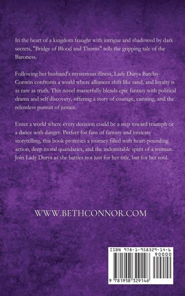 In the heart of a kingdom fraught with intrigue and shadowed by dark secrets, "Bridge of Blood and Thorns" tells the gripping tale of the Baroness. Following her husband's mysterious illness, Lady Durya Barclay-Conwin confronts a world where alliances shift like sand, and loyalty is as rare as truth. This novel masterfully blends epic fantasy with political drama and self discovery, offering a story of courage, cunning, and the relentless pursuit of justice. Enter a world where every decision could be a step toward triumph or a dance with danger. Perfect for fans of fantasy and intricate storytelling, this book promises a journey filled with heart-pounding action, deep moral quandaries, and the indomitable spirit of a woman. Join Lady Durya as she battles not just for her title, but for her soul.