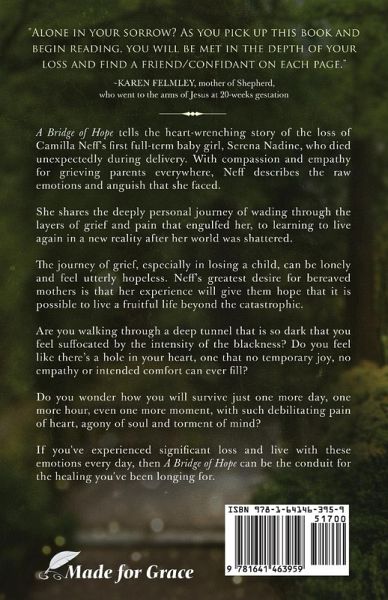 A Bridge of Hope tells the heart-wrenching story of the loss of Camilla Neff's first full-term baby girl, Serena Nadine, who died unexpectedly during delivery. With compassion and empathy for grieving parents everywhere, Neff describes the raw emotions and anguish that she faced. She shares the deeply personal journey of wading through the layers of grief and pain that engulfed her, to learning to live again in a new reality after her world was shattered. The journey of grief, especially in losing a child, can be lonely and feel utterly hopeless. Neff's greatest desire for bereaved mothers is that her experience will give them hope that it is possible to live a fruitful life beyond the catastrophic. Are you walking through a deep tunnel that is so dark that you feel suffocated by the intensity of the blackness? Do you feel like there's a hole in your heart, one that no temporary joy, no empathy or intended comfort can ever fill? Do you wonder how you will survive just one more day, one more hour, even one more moment, with such debilitating pain of heart, agony of soul and torment of mind? If you experienced significant loss and live with these emotions every day, then A Bridge of Hope may be the conduit for healing that you've been longing for.