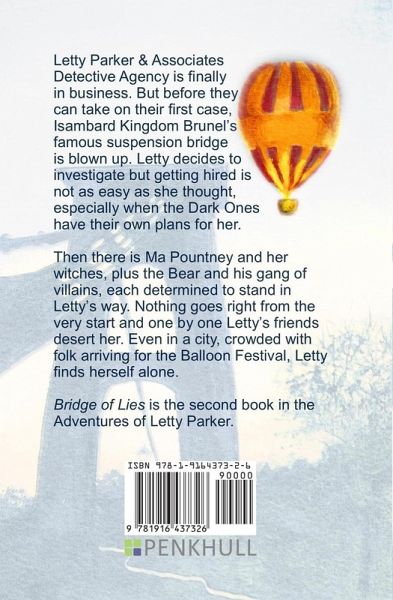 Letty Parker & Associates Detective Agency is finally in business. But before they can take on their first case, Isambard Kingdom Brunel's famous suspension bridge is blown up. Letty decides to investigate but getting hired is not as easy as she thought, especially when the Dark Ones have their own plans for her. Then there is Ma Pountney and her witches, plus the Bear and his gang of villains. Each determined to stand in Letty's way. Nothing goes right from the very start and one by one Letty's friends desert her. Even in a city, crowded with folk arriving for the Balloon Festival, Letty finds herself alone - and in the greatest of danger. Bridge of Lies is the next book in the Adventures of Letty Parker. Following on from City of Secrets, it is a magical fantasy adventure for 8-12 year olds set in an alternative world.