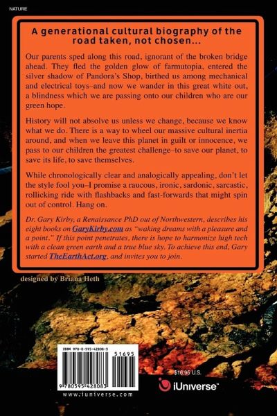 A generational cultural biography of the road taken, not chosen . Our parents sped along this road, ignorant of the broken bridge ahead. They fled the golden glow of farmutopia, entered the silver shadow of Pandora's Shop, birthed us among mechanical and electrical toys-and now we wander in this great white out, a white blindness which we are passing onto our children who are our green hope. History will not absolve us unless we change, because we know what we do. There is a way to wheel our massive cultural inertia around, and when we leave this planet in guilt or innocence, we pass to our children the greatest challenge-to save our planet, to save its life, to save themselves. While chronologically clear and analogically appealing, don't let the style fool you-I promise a raucous, ironic, sardonic, sarcastic, rollicking ride with flashbacks and fast-forwards that might spin out of control. Hang on. Dr. Gary Kirby, a Renaissance PhD out of Northwestern, describes his eight books on GaryKirby.com as "waking dreams with a pleasure and a point." If this point penetrates, there is hope to harmonize high tech with a clean green earth and a true blue sky. To achieve this end, Gary started TheEarthAct.org, and invites you to join.
