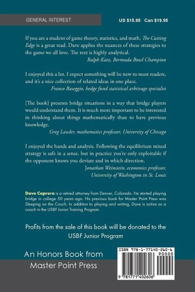 Profits from the sale of this book will be donated to the USBF Junior Program If you are a student of game theory, statistics, and math, The Cutting Edge is a great read. Dave applies the nuances of these strategies to the game we all love. The text is highly analytical. Ralph Katz, Bermuda Bowl Champion I enjoyed this a lot. I expect something will be new to most readers, and it's a nice collection of related ideas in one place. Franco Baseggio, hedge fund statistical arbitrage specialist [The book] presents bridge situations in a way that bridge players would understand them. It is much more important to be interested in thinking about things mathematically than to have previous knowledge. Greg Lawler, mathematics professor, University of Chicago I enjoyed the hands and analysis. Following the equilibrium mixed strategy is safe in a sense, but in practice you're only exploitable if the opponent knows you deviate and in which direction. Jonathan Weinstein, economics professor, University of Washington in St. Louis