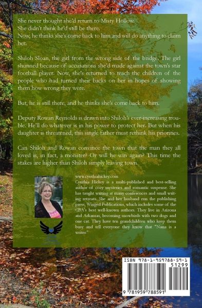 She never thought she'd return to Misty Hollow. She didn't think he'd still be there. Now, he thinks she's come back to him and will do anything to claim her. Shiloh Sloan, the girl from the wrong side of the bridge. The girl shunned because of accusations she'd made against the town's star football player. Now, she's returned to teach the children of the people who had turned their backs on her in hopes of showing them how wrong they were. But, he is still there, and he thinks she's come back to him. Deputy Rowan Reynolds is drawn into Shiloh's ever-increasing trouble. He'll do whatever is in his power to protect her. But when his daughter is threatened, this single father must rethink his priorities. Can Shiloh and Rowan convince the town that the man they all loved is, in fact, a monster? Or will he win again? This time the stakes are higher than Shiloh simply leaving town.