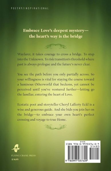 Embrace Love’s deepest mystery—the heart’s way is the bridge. Wayfarer, it takes courage to cross a bridge. To step into the Unknown. To risk transition’s threshold where past is always prologue and the future’s never clear. You see the path before you only partially across. So your willingness is vital for staying the course toward a luminous Otherworld that beckons, yet cannot be perceived until you’ve ventured further—letting go of the familiar, entering the heart of Love. Ecstatic poet and storyteller Cheryl Lafferty Eckl is a wise and generous guide. Now she bids you join her on the bridge—to embrace your own heart’s perfect crossing and voyage to true Home.