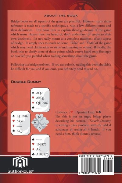 Bridge books on all aspects of the game are plentiful. However many times reference is made to a specific technique, a rule, a law, different terms and their definitions. This book tries to explain those guidelines of the game which many players have not heard of, don't understand or ignore to their own detriment. It's not really meant as a complete treatment of any aspect of bridge. It simply tries to touch on some "Oddz" and "Endz" of the game which may need clarification to some and learning to others. Basically, the book tries to clarify some of those points which you've heard only fleetingly or have left you puzzled when reading something about the game.
