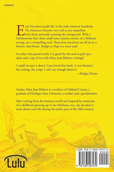 Each Novelette recalls life in the early nineteen hundreds. The characters become very real as you empathize with them anxiously awaiting the unexpected. With a Dickensonian feel, these small town country stories, in a Midwest setting, are a compelling read. These four novelettes are all set in a historic time frame. Bridges to Hope is a must read! In today's fast paced world, it is good for the soul to pull up a chair and a cup of tea with Mary Jean Roberts writings! I could not put it down. I just loved that book. It was fantastic, the writing, the script. I can't say enough about it. -Bridget Elwart