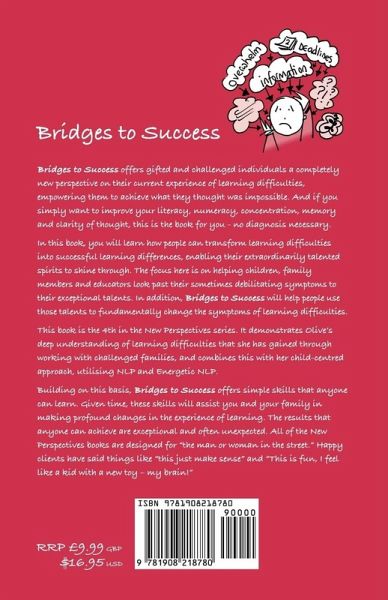 When you know something works you have to teach others. Learn how to transform learning difficulties into successful learning differences, enabling youngsters and adults alike to succeed. Bridges to Success offers visually talented yet challenged individuals a completely new perspective, empowering them to change themselves and the system around them. The focus is on positives and how people can be their very best. Threads of research, a wealth of experience and a variety of evidence have been pieced together to offer simple skills that anyone can learn to start making changes for the whole family and for any educational practice.
