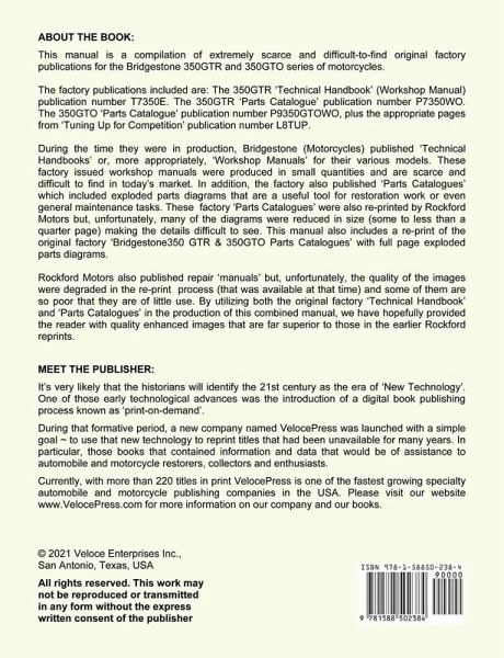178 pages, 203 illustrations, size 8.25 x 10.75 inches. A previously unpublished manual from the Floyd Clymer archives. This manual is a compilation of extremely scarce and difficult-to-find original factory publications for the Bridgestone 350GTR and 350GTO series of motorcycles.   The factory publications included are: The 350GTR 'Technical Handbook' (Workshop Manual) publication number T7350E. The 350GTR 'Parts Catalogue' publication number P7350WO. The 350GTO 'Parts Catalogue' publication number P9350GTOWO, plus the appropriate pages from 'Tuning Up for Competition' publication number L8TUP.   During the time they were in production, Bridgestone (Motorcycles) published 'Technical Handbooks' or, more appropriately, 'Workshop Manuals' for their various models. These factory issued workshop manuals were produced in small quantities and are scarce and difficult to find in today's market. In addition, the factory also published 'Parts Catalogues' which included exploded parts diagrams that are a useful tool for restoration work or even general maintenance tasks. These factory 'Parts Catalogues' were also re-printed by Rockford Motors but, unfortunately, many of the diagrams were reduced in size (some to less than a quarter page) making the details difficult to see. This manual also includes a re-print of the original factory 'Bridgestone350 GTR & 350GTO Parts Catalogues' with full page exploded parts diagrams.   Rockford Motors also published repair 'manuals' but, unfortunately, the quality of the images were degraded in the re-print process (that was available at that time) and some of them are so poor that they are of little use. By utilizing both the original factory 'Technical Handbook' and 'Parts Catalogues' in the production of this combined manual, we have hopefully provided the reader with quality enhanced images that are far superior to those in the earlier Rockford reprints.     As can be expected from a factory publication, there is adequate detailed text and diagrams to assist in major refurbishing or even a complete mechanical renovation making it an invaluable resource for collectors of these iconic motorcycles and we are pleased to be able to offer this reprint as a service to all Bridgestone 350GTR & 350GTO owners and enthusiasts worldwide.
