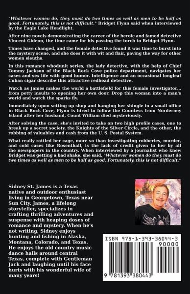 Bridget Flynn - A Female Detective Bridget Flynn Detective Series Book 1 - A NOVELLA "Whatever women do, they must do two times as well as men to be half as good. Fortunately, this is not difficult." Bridget Flynn said when interviewed by the Eagle Lake Headlight. After nine novels demonstrating the career of the heroic and famed detective Vincent Gideon, the time came for his passing the torch to Bridget Flynn. Times have changed, and the female detective found it was time to burst into the mystery scene, and she does it with wit and flair, paving the way for other women sleuths. Fans around the world adored the woman detective, Bridget Flynn, in her debut as a side-kick with Vincent Gideon in the novel, Rosenthall, Book 1 in the Gideon Detective Series. She used her undercover name of Agatha throughout the case. In this romance whodunit series, the lady detective, with the help of Chief Tommy Jackson of the Black Rock Cove police department, navigates her cases and sex life with good humor. Intelligence and an occasional longleaf Cuban cigar describe this attractive redhead detective. This first novel in Sidney St. James widely acclaimed Detective Series tells story after story of our delightful, cunning and brilliant woman sleuth, Bridget Flynn. Watch as James makes the world a battlefield for this female investigator… from petty insults to opening her own door. Drop this woman into a man's world and watch the sparks fly. Immediately upon setting up shop and hanging her shingle in a small office in Black Rock Cove, Flynn is hired to follow the Countess from Norderney Island after her husband, Count William died mysteriously. (Read about the beautiful countess in Book 7 of the Love Lost Series, NORDERNEY ISLAND) After solving the case, she's invited to take on two high profile cases, one to break up a secret society, the Knights of the Silver Circle and the other, the robbing of valuables and cash from the U. S. Postal System. What really rattled her cage, more so than investigating robberies, murder and cold cases like Rosenthall, is the lack of credit given to her by all the newspapers in the country. When interviewed by a journalist who knew Bridget was getting a bad shake, she said, "Whatever women do they must do two times as well as men to be half as good. Fortunately, this is not difficult." Author James has found the opportunity to allow his female main characters the time to break the rules! For example, with a stroke of James' keyboard in the Rose of Brays Bayou, the award-winning author brings to life in creative nonfiction the story of the Runaway Scrape starring Dilue Rose Harris. God Bless Texas Women.