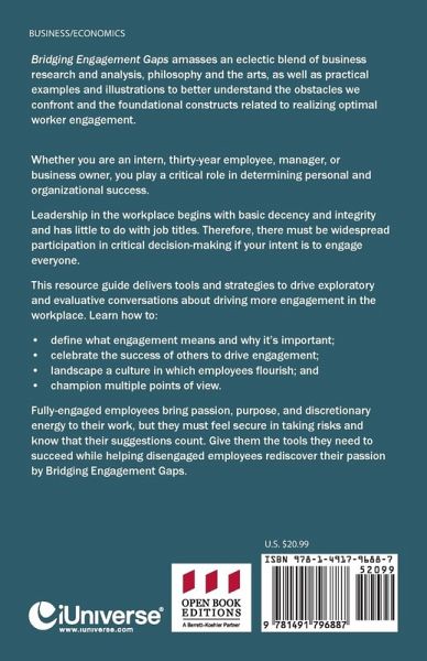 Bridging Engagement Gaps amasses an eclectic blend of business research and analysis, philosophy and the arts, as well as practical examples and illustrations to better understand the obstacles we confront and the foundational constructs related to realizing optimal worker engagement. Whether you are an intern, thirty-year employee, manager, or business owner, you play a critical role in determining personal and organizational success. Leadership in the workplace begins with basic decency and integrity and has little to do with job titles. Therefore, there must be widespread participation in critical decision-making if your intent is to engage everyone. This resource guide delivers tools and strategies to drive exploratory and evaluative conversations about driving more engagement in the workplace. Learn how to: • define what engagement means and why it’s important; • celebrate the success of others to drive engagement; • landscape a culture in which employees flourish; and • champion multiple points of view. Fully-engaged employees bring passion, purpose, and discretionary energy to their work, but they must feel secure in taking risks and know that their suggestions count. Give them the tools they need to succeed while helping disengaged employees rediscover their passion by Bridging Engagement Gaps.