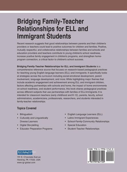 Recent research suggests that good relationships between parents and their children's providers or teachers could lead to positive outcomes for children and families. Positive, mutually respectful, and collaborative relationships between families and schools and education providers and teachers contribute to young children's school readiness, increase positive family engagement in children's programs, and strengthen home-program connection, a critical factor to children's school success. Bridging Family-Teacher Relationships for ELL and Immigrant Students is a comprehensive reference source that focuses on research-based pedagogical practices for teaching young English language learners (ELL) and immigrants. It specifically looks at strategies across the curriculum including social-emotional development, parent involvement, language development, and more. While highlighting major themes that include academic engagement and achievement among ELL and immigrant children, factors affecting partnerships with schools and home, the impact of home environments on school readiness, and student performance, this book shares pedagogical practices across different subjects that use partnerships with families of ELL/immigrants. It is intended for classroom teachers (early childhood and K-12), parents, faculty, school administrators, academicians, professionals, researchers, and students interested in family-teacher relationships.