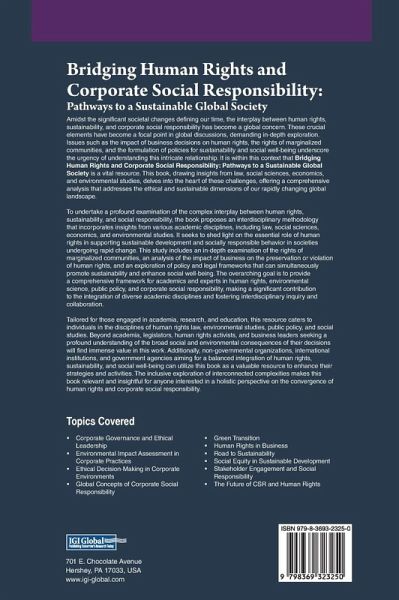 Amidst the significant societal changes defining our time, the interplay between human rights, sustainability, and corporate social responsibility has become a global concern. These crucial elements have become a focal point in global discussions, demanding in-depth exploration. Issues such as the impact of business decisions on human rights, the rights of marginalized communities, and the formulation of policies for sustainability and social well-being underscore the urgency of understanding this intricate relationship. It is within this context that Bridging Human Rights and Corporate Social Responsibility: Pathways to a Sustainable Global Society is a vital resource. This book, drawing insights from law, social sciences, economics, and environmental studies, delves into the heart of these challenges, offering a comprehensive analysis that addresses the ethical and sustainable dimensions of our rapidly changing global landscape. To undertake a profound examination of the complex interplay between human rights, sustainability, and social responsibility, the book proposes an interdisciplinary methodology that incorporates insights from various academic disciplines, including law, social sciences, economics, and environmental studies. It seeks to shed light on the essential role of human rights in supporting sustainable development and socially responsible behavior in societies undergoing rapid change. This study includes an in-depth examination of the rights of marginalized communities, an analysis of the impact of business on the preservation or violation of human rights, and an exploration of policy and legal frameworks that can simultaneously promote sustainability and enhance social well-being. The overarching goal is to provide a comprehensive framework for academics and experts in human rights, environmental science, public policy, and corporate social responsibility, making a significant contribution to the integration of diverse academic disciplines and fostering interdisciplinary inquiry and collaboration.