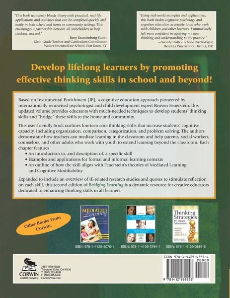 'This book seamlessly blends theory with practical, real-life applications and activities that can be completed quickly and easily in both school and homemmunity settings. This encourages a partnership between all stakeholders to help students succeed'-Betty Brandenburg Yundt, Sixth-Grade Teacher, Curriculum Coordinator, Walker Intermediate School, Fort Knox, KY 'Using real-world examples and applications, this book makes cognitive psychology and cognitive education accessible to all who work with children and other learners. I immediately felt more confident in applying my new thinking and understanding to my practice'-Wendy Holley, School Psychologist, Bend-La Pine School District, OR Based on Instrumental Enrichment (IE), a cognitive education approach pioneered by internationally renowned psychologist and child development expert Reuven Feuerstein, this updated volume provides practitioners with much-needed techniques to develop students' thinking skills and "bridge" these skills to the home and community. This user-friendly book outlines fourteen core thinking skills that increase students' cognitive capacity, including organization, comparison, categorization, and problem solving. The authors demonstrate how teachers can mediate learning in the classroom and help parents, social workers, counsellors, and other adults who work with youth to extend learning beyond the classroom. Each chapter features: - An introduction to and description of a specific skill - Examples and applications for formal and informal learning contexts - An outline of how the skill aligns with Feuerstein's theories of Mediated Learning and Cognitive Modifiability Expanded to include an overview of many IE-related research studies and quotes to stimulate reflection on each skill, this second edition of Bridging Learning is a dynamic resource for creative educators dedicated to enhancing thinking skills in all learners.