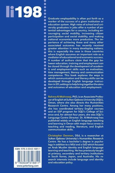Graduate employability is often put forth as a marker of the success of a given institution or education system. High rates of school and university graduates in jobs offer a number of potential advantages for a country, including encouraging social mobility, increasing citizen participation and social stability, and making national economies more productive. The importance of achieving these and many other associated outcomes has recently received greater attention in many developing nations; this is especially the case in those countries where English assumes an important role as a mediator of educational and economic success. A number of authors claim that the gap between education, training and employment can be closed through the development of academic and employment skills such as motivation, time management, literacy and communication competence. This book explores the ways in which communication and literacy skills can be developed through English language instruction inEFL settings to help bring together the aims and outcomes of education and employment.