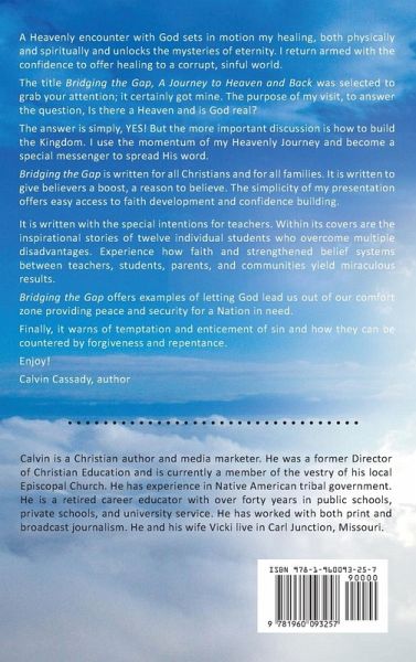 A Heavenly encounter with God sets in motion my healing, both physically and spiritually and unlocks the mysteries of eternity. I return armed with the confidence to offer healing to a corrupt, sinful world. The title Bridging the Gap, A Journey to Heaven and Back was selected to grab your attention; It certainly got mine. The purpose of my visit, to answer the question, Is there a Heaven and is God real? The answer is simply, YES! But the more important discussion is how to build the Kingdom. I use the momentum of my Heavenly Journey and become a special messenger to spread His word. Bridging the Gap is written for all Christians and for all families. It is written to give believers a boost, a reason to believe. The simplicity of my presentation offers easy access to faith development and confidence building. It is written with the special intentions for teachers. Within its covers are the inspirational stories of twelve individual students who overcome multiple disadvantages. Experience how faith and strengthened belief systems between teachers, students, parents, and communities yield miraculous results. Bridging the Gap offers examples of letting God lead us out of our comfort zone providing peace and security for a Nation in need. Finally, it warns of temptation and enticement of sin and how they can be countered by forgiveness and repentance. Enjoy! Calvin Cassady, author