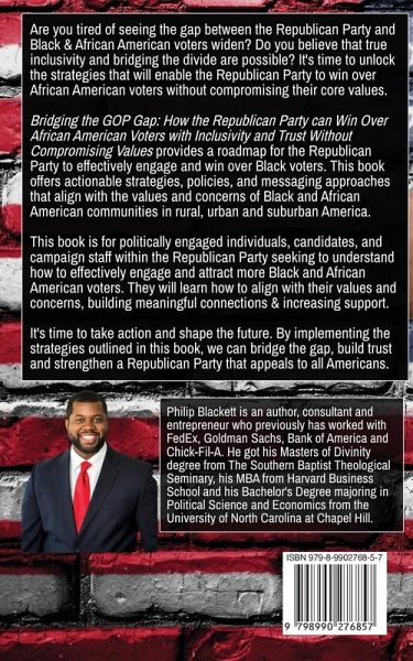 Are you tired of seeing the gap between the Republican Party and Black & African American voters widen? Do you believe that true inclusivity and bridging the divide are possible? It's time to unlock the strategies that will enable the Republican Party to win over African American voters without compromising their core values. Bridging the GOP Gap: How the Republican Party can Win Over African American Voters with Inclusivity and Trust Without Compromising Values provides a roadmap for the Republican Party to effectively engage and win over Black voters. This book offers actionable strategies, policies, and messaging approaches that align with the values and concerns of Black and African American communities in rural, urban and suburban America. This book is for politically engaged individuals, candidates, and campaign staff within the Republican Party seeking to understand how to effectively engage and attract more Black and African American voters. They will learn how to align with their values and concerns, building meaningful connections & increasing support. It's time to take action and shape the future. By implementing the strategies outlined in this book, we can bridge the gap, build trust and strengthen a Republican Party that appeals to all Americans.