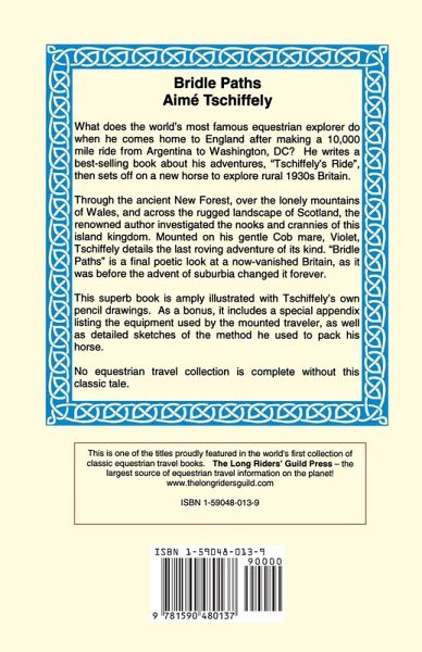 What does the world¿s most famous equestrian explorer do when he comes home to England after making a 10,000 mile ride from Argentina to Washington, DC? He writes a best-selling book about his adventures, ¿Tschiffely¿s Ride¿, then sets off on a new horse to explore rural 1930s Britain. Through the ancient New Forest, over the lonely mountains of Wales, and across the rugged landscape of Scotland, the renowned author investigated the nooks and crannies of this island kingdom. Mounted on his gentle Cob mare, Violet, Tschiffely details the last roving adventure of its kind. ¿Bridle Paths¿ is a final poetic look at a now-vanished Britain, as it was before the advent of suburbia changed it forever. This superb book is amply illustrated with Tschiffely¿s own pencil drawings. As a bonus, it includes a special appendix listing the equipment used by the mounted traveler, as well as detailed sketches of the method he used to pack his horse. No equestrian travel collection is complete without this classic tale.