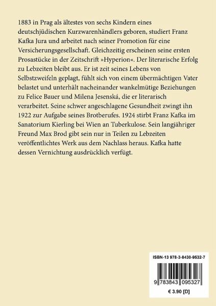 1883 in Prag als ältestes von sechs Kindern eines deutschjüdischen Kurzwarenhändlers geboren, studiert Franz Kafka Jura und arbeitet nach seiner Promotion für eine Versicherungsgesellschaft. Gleichzeitig erscheinen seine ersten Prosastücke in der Zeitschrift "Hyperion". Der literarische Erfolg zu Lebzeiten bleibt aus. Er ist zeit seines Lebens von Selbstzweifeln geplagt, fühlt sich von einem übermächtigen Vater belastet und unterhält nacheinander wankelmütige Beziehungen zu Felice Bauer und Milena Jesenská, die er literarisch verarbeitet. Seine schwer angeschlagene Gesundheit zwingt ihn 1922 zur Aufgabe seines Brotberufes. 1924 stirbt Franz Kafka im Sanatorium Kierling bei Wien an Tuberkulose. Sein langjähriger Freund Max Brod gibt sein nur in Teilen zu Lebzeiten veröffentlichtes Werk aus dem Nachlass heraus. Kafka hatte dessen Vernichtung ausdrücklich verfügt.