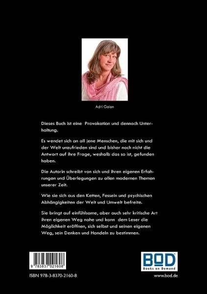 Dieses Buch ist eine Provokation und dennoch Unterhaltung.Es wendet sich an all jene Menschen, die mit sich und der Welt unzufrieden sind und bisher noch nicht die Antwort auf ihre Frage, weshalb das so ist, gefunden haben.Die Autorin schreibt von sich und ihren eigenen Erfahrungen und Überlegungen zu allen modernen Themen unserer Zeit, wie sie sich aus den Ketten, Fesseln und psychischen Abhängigkeiten der Welt und Umwelt befreite.Sie bringt auf einfühlsame, aber auch sehr kritische Art ihren eigenen Weg nahe und kann so dem Leser die Möglichkeit eröffnen, sich selbst und seinen eigenen Weg, sein Denken und Handeln zu bestimmen.Unterhaltsam, erschreckend und auch lehrreich. Sie sollten es unbedingt lesen.