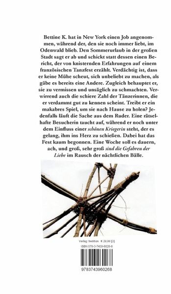 Bettine K. hat in New York einen Job angenommen, während der, den sie noch immer liebt, im Odenwald blieb. Den Sommerurlaub in der großen Stadt sagt er ab und schickt statt dessen einen Bericht, der von knisternden Erfahrungen auf einem französischen Tanzfest erzählt. Verdächtig ist, dass er keine Mühe scheut, sich unbeliebt zu machen, als gäbe es bereits eine Andere. Zugleich behauptet er, sie zu vermissen und unsäglich zu schmachten. Verwirrend auch die schiere Zahl der Tänzerinnen, die er verdammt gut zu kennen scheint. Treibt er ein makabres Spiel, um sie nach Hause zu holen? Jedenfalls läuft die Sache aus dem Ruder. Eine rätselhafte Besucherin taucht auf, während er noch unter dem Einfluss einer "schönen Kriegerin" steht, der es gelang, ihm ins Herz zu schießen. Dabei hat das Fest kaum begonnen. Eine Woche soll es dauern, ach, und groß, sehr groß sind die Gefahren der Liebe im Rausch der nächtlichen Bälle.