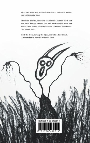 Chill your bones with two hundred and forty two horror stories, one sentence at a time. Monsters, demons, creatures and oddities. Murder, death and the dead. Family, friends, love and relationships. Food and eating. Fear, dread, and the unknown. Crime and punishment. The human body. Lock the doors, turn up the lights, and take a deep breath. A series of brief, horrible moments await.
