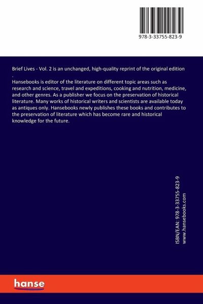 Brief Lives - Vol. 2 is an unchanged, high-quality reprint of the original edition .Hansebooks is editor of the literature on different topic areas such as research and science, travel and expeditions, cooking and nutrition, medicine, and other genres. As a publisher we focus on the preservation of historical literature. Many works of historical writers and scientists are available today as antiques only. Hansebooks newly publishes these books and contributes to the preservation of literature which has become rare and historical knowledge for the future.
