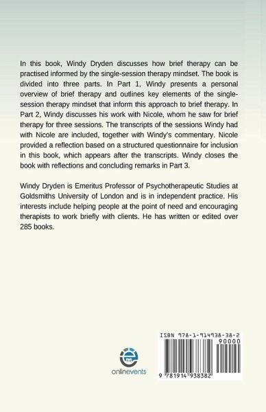 In this book, Windy Dryden discusses how brief therapy can be practised informed by the single-session therapy mindset. The book is divided into three parts. In Part 1, Windy presents a personal overview of brief therapy and outlines key elements of the single-session therapy mindset that inform this approach to brief therapy. In Part 2, Windy Dryden discusses his work with Nicole, whom he saw for brief therapy for three sessions. The transcripts of the sessions Windy had with Nicole are included, together with his commentary. Nicole provided a reflection based on a structured questionnaire for inclusion in this book, which appears after the transcripts. Windy Dryden closes the book with reflections and concluding remarks in Part 3.