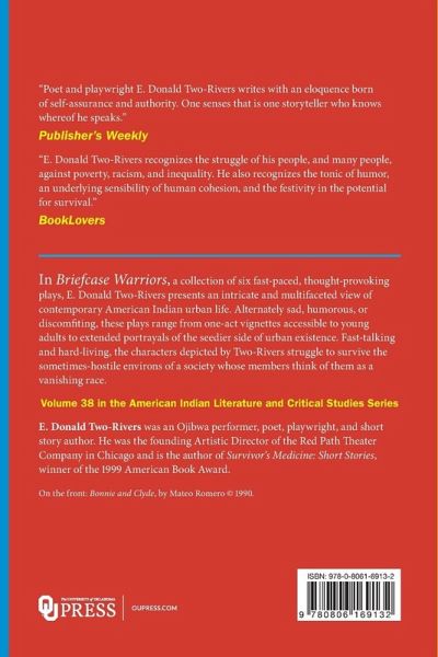In Briefcase Warriors, a collection of six fast-paced, thought-provoking plays, E. Donald Two-Rivers presents an intricate and multifaceted view of contemporary American Indian urban life. Alternately sad, humorous, or discomfiting, these plays range from one-act vignettes accessible to young adults to extended portrayals of the seedier side of urban existence. Fast-talking and hard-living, the characters depicted by Two-Rivers struggle to survive the sometimes hostile environs of a society whose members think of them as a vanishing race. The plays included are: Winter Summit or the Bang-Bang Incident; Forked Tongues; Chili Corn; Coyote Sits in Judgment; Shattered Dream; and Old Indian Trick (An Old Urban Indian Story as Told by an Old Urban Indian Who May Have Lied).
