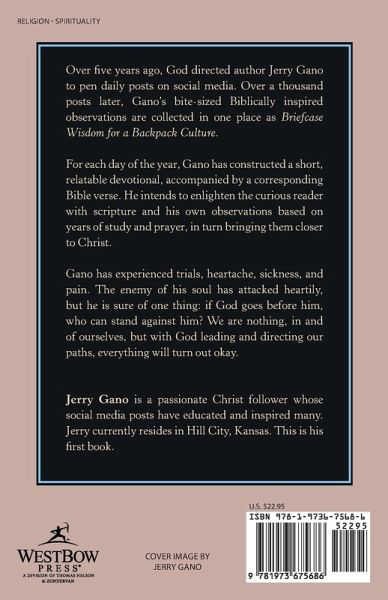 Over five years ago, God directed author Jerry Gano to pen daily posts on social media. Over a thousand posts later, Gano's bite-sized Biblically inspired observations are collected in one place as Briefcase Wisdom for a Backpack Culture. For each day of the year, Gano has constructed a short, relatable devotional, accompanied by a corresponding Bible verse. He intends to enlighten the curious reader with scripture and his own observations based on years of study and prayer, in turn bringing them closer to Christ. Gano has experienced trials, heartache, sickness, and pain. The enemy of his soul has attacked heartily, but he is sure of one thing: if God goes before him, who can stand against him? We are nothing, in and of ourselves, but with God leading and directing our paths, everything will turn out okay.