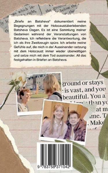"Briefe an Batsheva" dokumentiert meine Begegnungen mit der Holocaustüberlebenden Batsheva Dagan. Es ist eine Sammlung meiner Gedanken während der Veranstaltungen von Batsheva. Ich reflektiere die Verantwortung, die ich als ihre Zweitzeugin spüre. Ich arbeite meine Gefühle auf, die mich in der Auseinandersetzung mit dem Holocaust immer wieder überwältigen und setze mich mit dem Tod auseinander. All das festgehalten in Briefen an Batsheva.