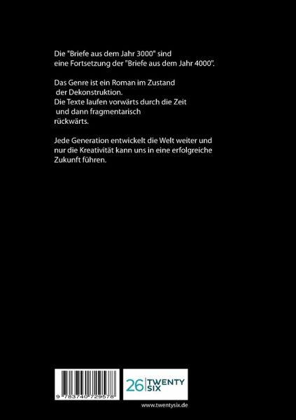 Die "Briefe aus dem Jahr 3000" sind eine Fortsetzung der "Briefe aus dem Jahr 4000".Das Genre ist ein Roman im Zustand der Dekonstruktion. Die Texte laufen vorwärts durch die Zeit und dann fragmentarisch rückwärts. Jede Generation entwickelt die Welt weiter und nur die Kreativität kann uns in eine erfolgreiche Zukunft führen.