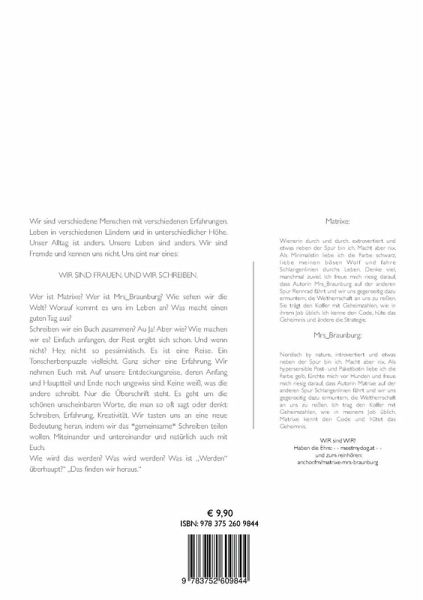 Wir sind verschiedene Menschen mit verschiedenen Erfahrungen. Leben in verschiedenen Ländern und in unterschiedlicher Höhe. Unser Alltag ist anders. Unsere Leben sind anders. Wir sind Fremde und kennen uns nicht. Uns eint nur eines: Wir sind Frauen. Und wir schreiben.Wer ist Matrixe? Wer ist Mrs_Braunburg? Wie sehen wir die Welt? Worauf kommt es uns im Leben an? Was macht einen guten Tag aus?Schreiben wir ein Buch zusammen? Au Ja! Aber wie? Wie machen wir es? Einfach anfangen, der Rest ergibt sich schon. Und wenn nicht? Hey, nicht so pessimistisch. Es ist eine Reise. Ein Tonscherbenpuzzle vielleicht. Ganz sicher eine Erfahrung. Wir nehmen Euch mit. Auf unsere Entdeckungsreise, deren Anfang und Hauptteil und Ende noch ungewiss sind. Keine weiß, was die andere schreibt. Nur die Überschrift steht. Es geht um die schönen unscheinbaren Worte, die man so oft sagt oder denkt: Schreiben, Erfahrung, Kreativität. Wir tasten uns an eine neue Bedeutung heran, indem wir das _gemeinsame_ Schreiben teilen wollen. Miteinander und untereinander und natürlich auch mit Euch.Wie wird das werden? Was wird werden? Was ist WERDEN überhaupt? Das finden wir heraus.