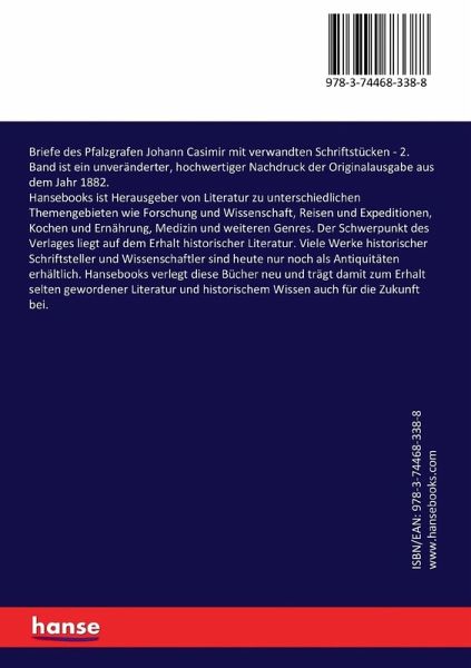 Briefe des Pfalzgrafen Johann Casimir mit verwandten Schriftstücken - 2. Band ist ein unveränderter, hochwertiger Nachdruck der Originalausgabe aus dem Jahr 1882.