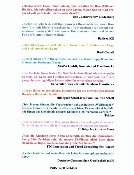 Dosierung: 2-10 Seiten täglich, je nach Bedarf, auch gerne in der Mittagspause, damit die Stunden bis zum Feierabend schneller vergehen. Besonders wirksam, wenn laut gelesen. Auf eine mögliche Ansteckung durch den Lachbazillus wird ausdrücklich hingewiesen! Dieses Buch kann krampfartige Lachanfälle hervorrufen. Gegenanzeigen: Humorlosigkeit. Besserwisserei. Begriffsstutzigkeit. Stumpfsinn. Zu Risiken und Nebenwirkungen fragen Sie bitte Ihren Buchhändler. Bekloppte Briefe an bekannte Stars, Topmanager, Firmenbosse und Großkopferte mit den blödsinnigsten Anfragen, Wünschen und Ideen. Das Verblüffendste an diesem Buch ist die Tatsache, daß die Autorin ausnahmslos Antwort erhielt.