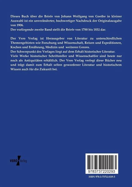 Dieses Buch über die Briefe von Johann Wolfgang von Goethe in kleiner Auswahl ist ein unveränderter, hochwertiger Nachdruck der Originalausgabe von 1906. Der vorliegende zweite Band stellt die Briefe von 1788 bis 1832 dar. Der Vero Verlag ist Herausgeber von Literatur zu unterschiedlichen Themengebieten wie Forschung und Wissenschaft, Reisen und Expeditionen, Kochen und Ernährung, Medizin und weiteren Genres. Der Schwerpunkt des Verlages liegt auf dem Erhalt historischer Literatur. Viele Werke historischer Schriftsteller und Wissenschaftler sind heute nur noch als Antiquitäten erhältlich.…mehr