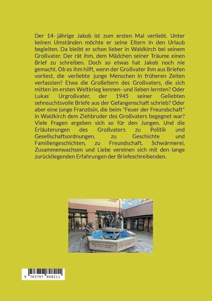 Der 14-jährige Jakob ist zum ersten Mal verliebt. Da er unter keinen Umständen seine Eltern in den Urlaub begleiten will, muss er in Waldkirch bei seinem Großvater bleiben. Der rät ihm, dem Mädchen seiner Träume einen Brief zu schreiben. Doch so etwas hat Jakob noch nie gemacht. Ob es ihm hilft, wenn der Großvater ihm aus Briefen vorliest, die andere verliebte junge Menschen zu unterschiedlichen Zeiten verfasst haben?Was wussten sich die Großeltern des Großvaters, die sich mitten im ersten Weltkrieg kennengelernt hatten, in ihren Briefen von 1916 und 1917 zu sagen? Wie formulierte sein Vater die Gefühle voller Sehnsucht nach seiner Geliebten aus der Kriegsgefangenschaft des Jahres 1945 im sommerlich heißen Italien? Welche Themen bewegten Jugendliche in Deutschland und Frankreich in der zweiten Hälfte der 60er Jahre des letzten Jahrhunderts, und wie brachte sie eine junge Französin zu Papier, die beim "Feuer der Freundschaft" während eines Zeltlagers in Waldkirch den Ziehbruder des Großvaters kennen und schätzen gelernt hatte?Während der alte Mann und der Junge die Ferientage auch nutzten, Waldkirch, seine Sehenswürdigkeiten und seine Umgebung näher kennen zu lernen, steht der Großvater seinem Enkel für all die Fragen zur Verfügung, die sich aus den Briefen der drei zurückliegenden Generationen naturgemäß ergeben. Und so vereinen sich seine Erläuterungen zu Politik, Gesellschaftsordnungen, Geschichte und Familiengeschichte, zu Freundschaft, Schwärmerei, Zusammenwachsen und Liebe mit den Erfahrungen der Briefschreibenden zu einem unverwechselbaren Gesamtbild.
