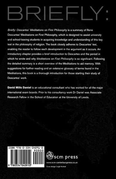 The "SCM Briefly" series is a series of summarized texts that are commonly used on theology and philosophy A level and Level One undergraduate courses in the UK. As students are less likely today to come to these subjects with language experience, the "Briefly" series, summarising the meaning of the original texts, is a painless and quick way to get to grips with what the philosophers were writing about. The language throughout is modern and approachable, but the books manage to avoid "dumbing down" by including line by line analysis and short quotes to give students a feel for the original. In addition, each book begins with an introduction, providing a context for the writer and his writings, a short summary as well as the detailed summary and each book also contains a glossary of terms. Descartes' "Meditations on First Philosophy", published in 1641, was designed for the philosopher and for the theologian. It consists of six meditations, Of the Things that we may doubt, Of the Nature of the Human Mind, Of God: that He exists, Of Truth and Error, Of the Essence of Material Things, Of the Existence of Material Things and of the Real Distinction between the Mind and the Body of Man. However, many scientists were opposed to Descartes' ideas, even in his own lifetime. Although famous as a mathematician, his mechanics of how the world exists, were proven not to be possible by Newton. This did not stop his ideas being championed in Europe for over a hundred years. His philosophy is one that students cannot be without and this "Briefly" provides a thorough and accessible guide to one of his most important works.