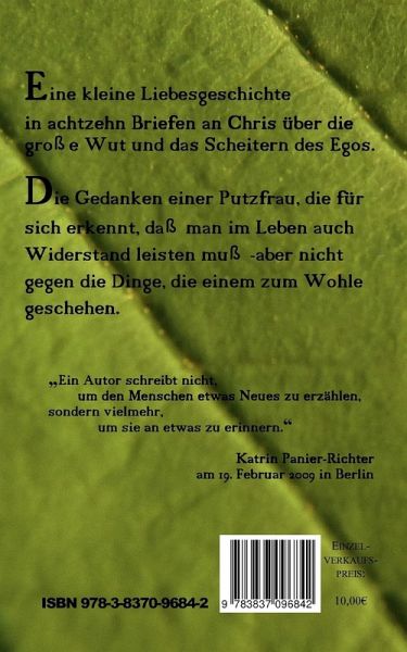 Eine kleine Liebesgeschichte in achtzehn Briefen an Chris über die große Wut und das Scheitern des Egos.Die Gedanken einer Berliner Putzfrau, die für sich erkennt, dass man im Leben auch Widerstand leisten muss -aber nicht gegen die Dinge, die einem zum Wohle geschehen.